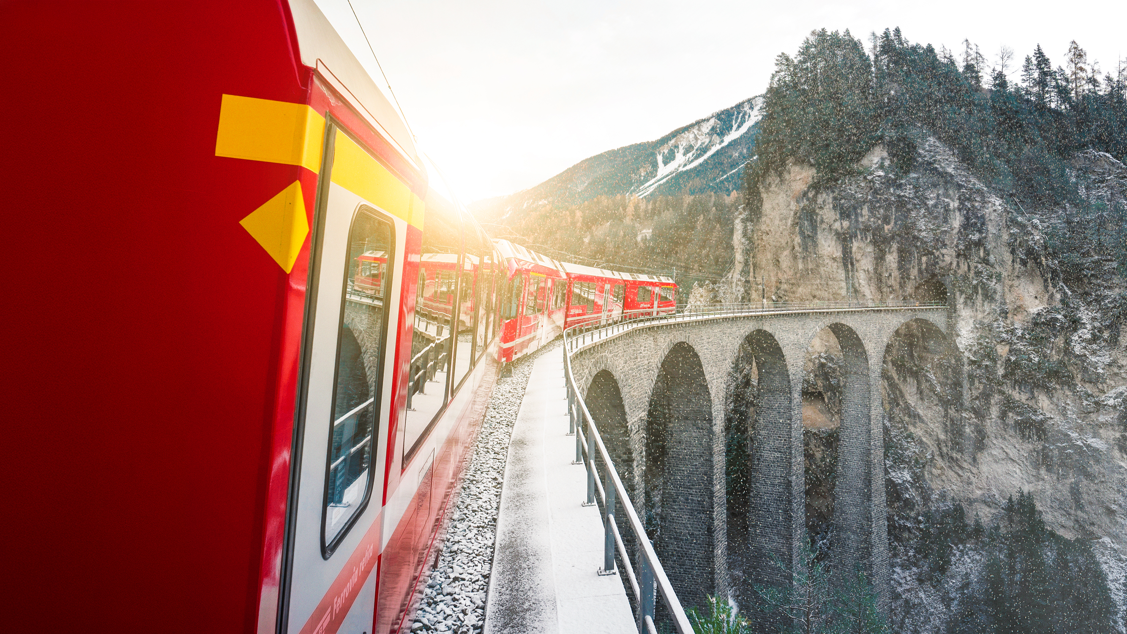 Tag med toget 'Bernina Express', og kom med på en festlig togrejse gennem Alperne med sneklædte tinder, arkitektoniske vidundere og majestætiske gletsjere.