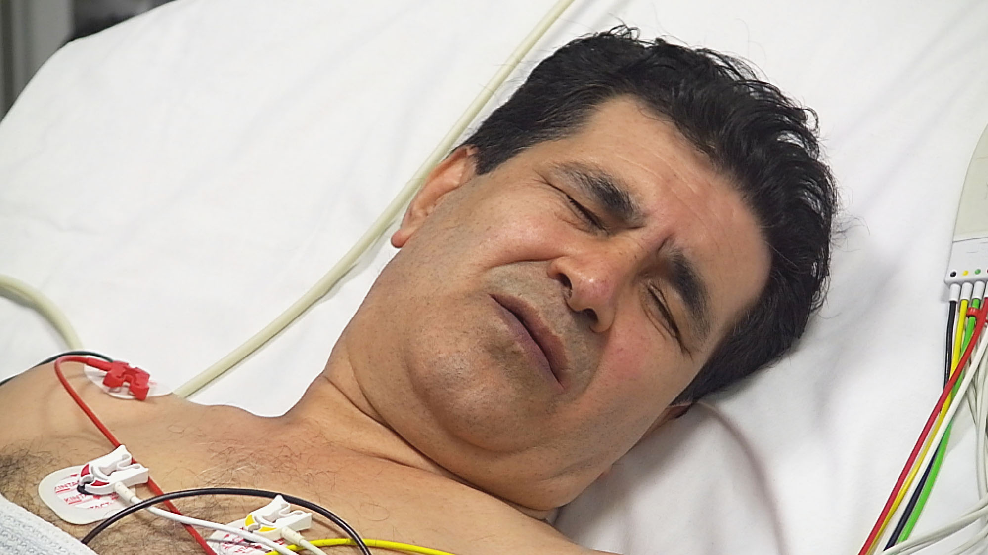 58-årige Jahan har voldsomme smerter i brystet, og lægerne på St George’s hospital i London er bange for, at han er ved at få hjertestop.