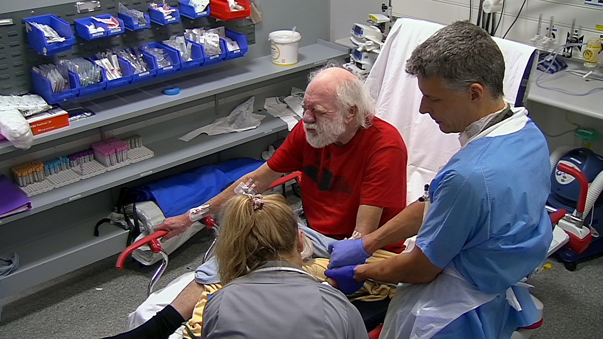 Den 77-årige John bliver hastet til skadestuen, da der er mistanke om, at han har hul på kranspulsåren. Motorcyklisten Jamie har ramt en bil på en motorvejsafkørsel