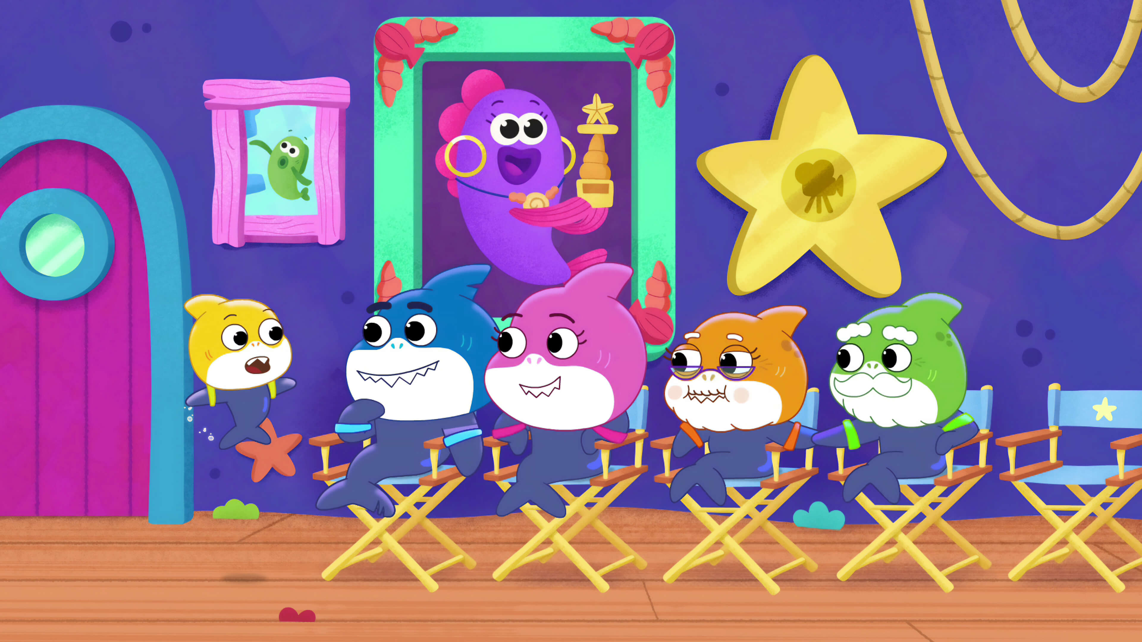 Haj-familien deler sig for at finde skatte. Baby overbeviser far om at sige 'jeps' for en dag.