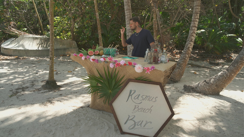 Efter den chokerende roseceremoni er stemningen i huset trykket. Rasmus åbner en strandbar og serverer drinks - dog ikke med den helt store succes.