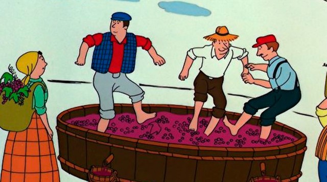 Hele familien har travlt med druehøsten - det går langsomt. Barbablå opfinder en presse med en skrue uden ende, men er det den rigtige løsning?.