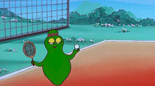 Barbarød viser Barbablå og Barbagrøn, at han er rigtig god til at spille tennis og til sport i det hele taget, men ikke til ridning