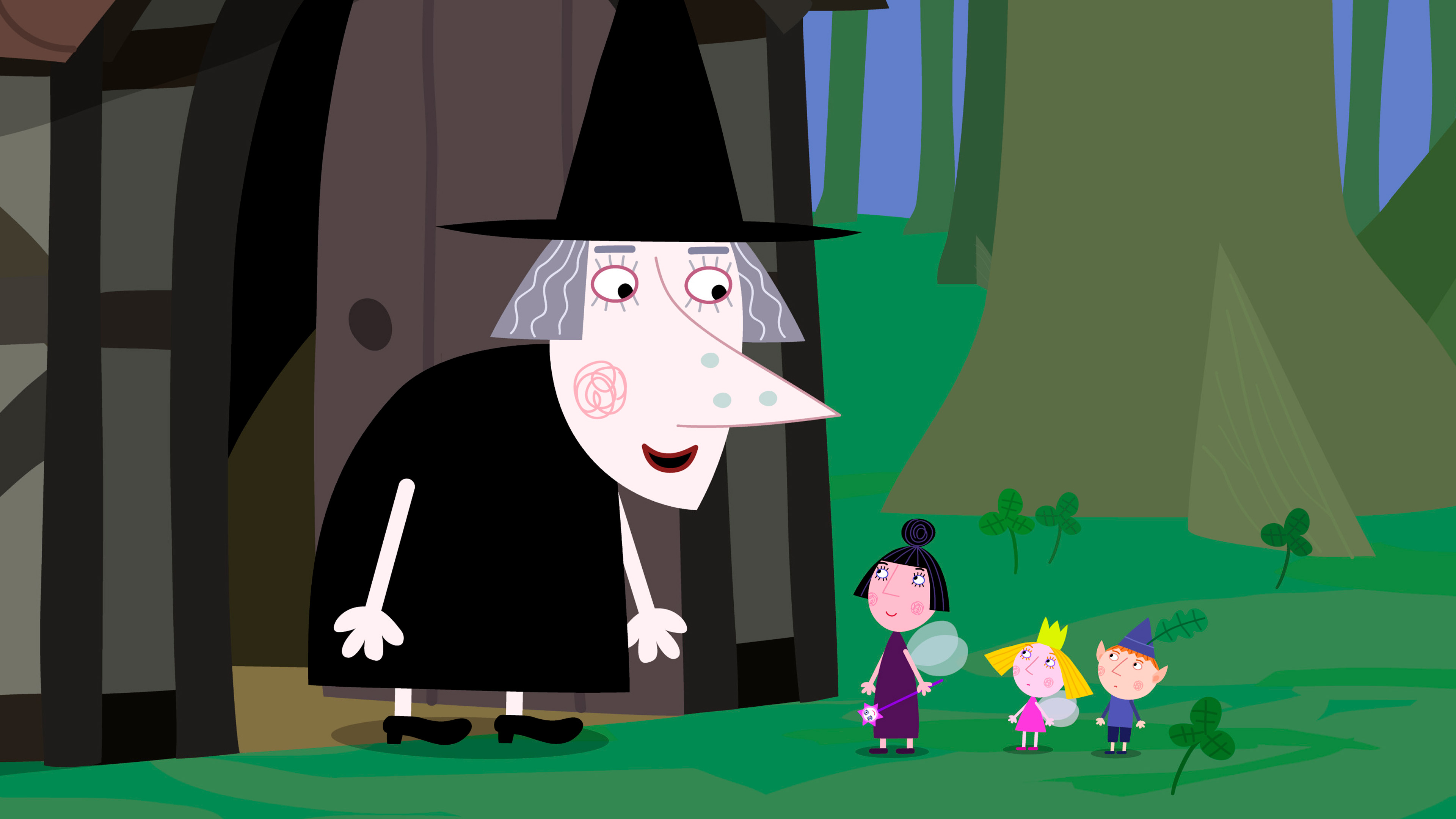 Dronningen læser en bog for Ben og Holly om en slem heks, så fru Blomme tager børnene med ud for at se en virkelige heks, der bor i skoven.