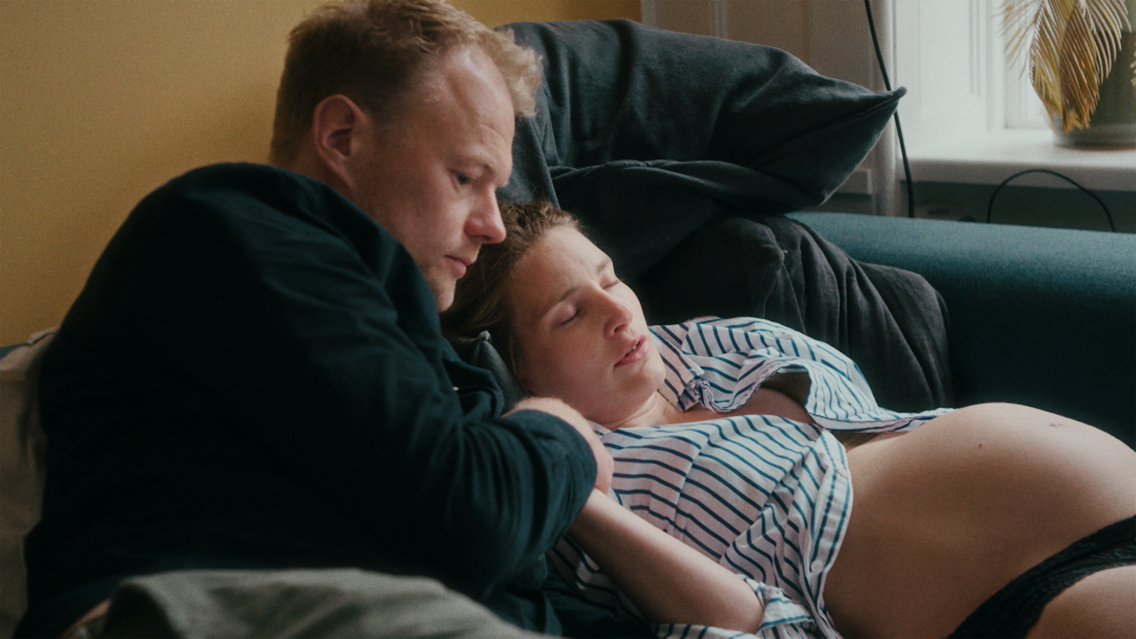 Veerne ulmer. Trine har ønsket at føde hjemme, og selvom alt er nyt og uvant, støtter Christian, mens Trine udfører et mirakel på parrets sofa. .