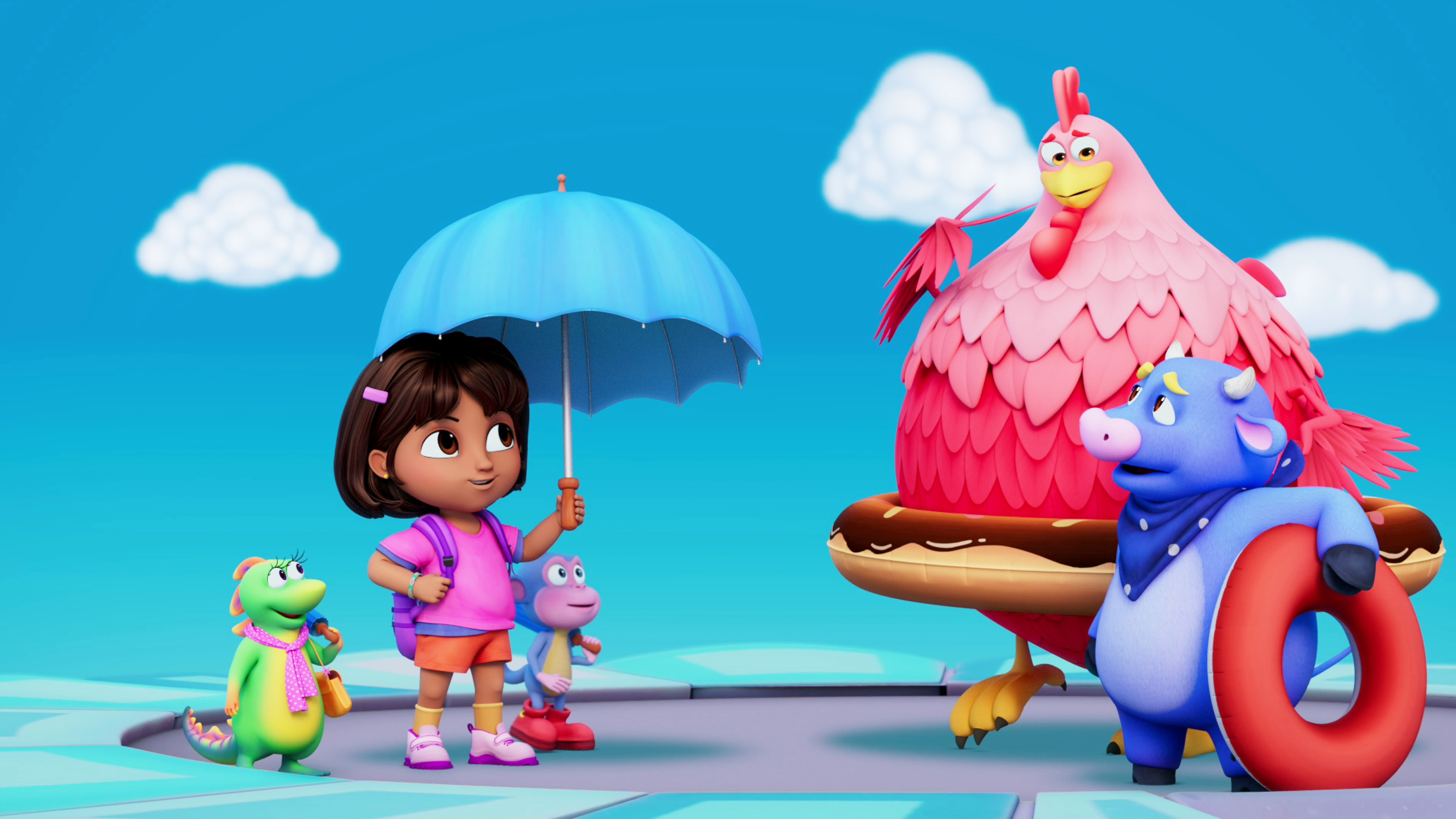 Dora og Boots ræser mod krokodiller, og senere inviterer hun sine venner med til den Store Røde Kyllings fødselsdag.