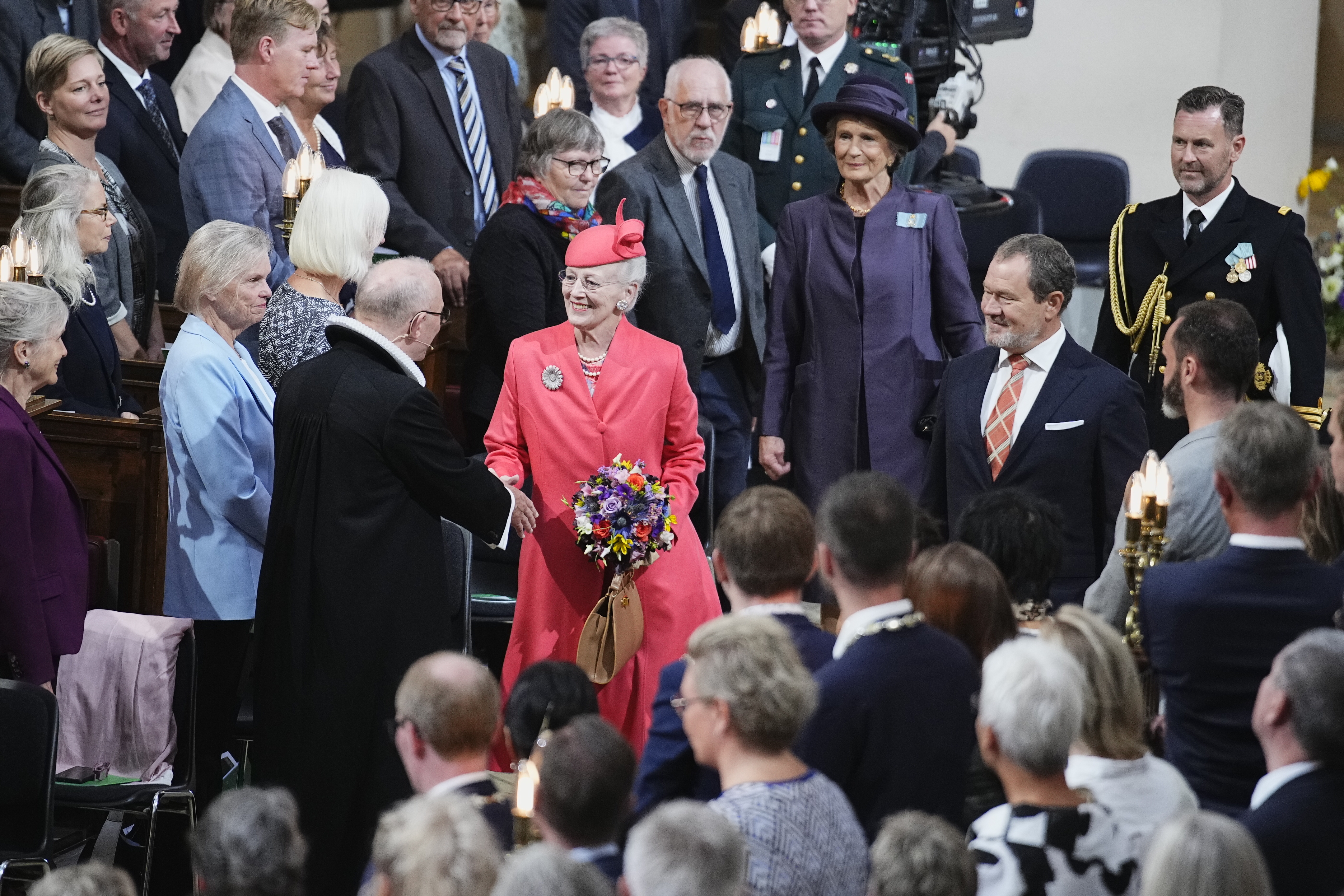 Dronning Margrethe deltager i gudstjenesten i anledning af sit regeringsjubilæum sammen med den kongelige familie og inviterede gæster