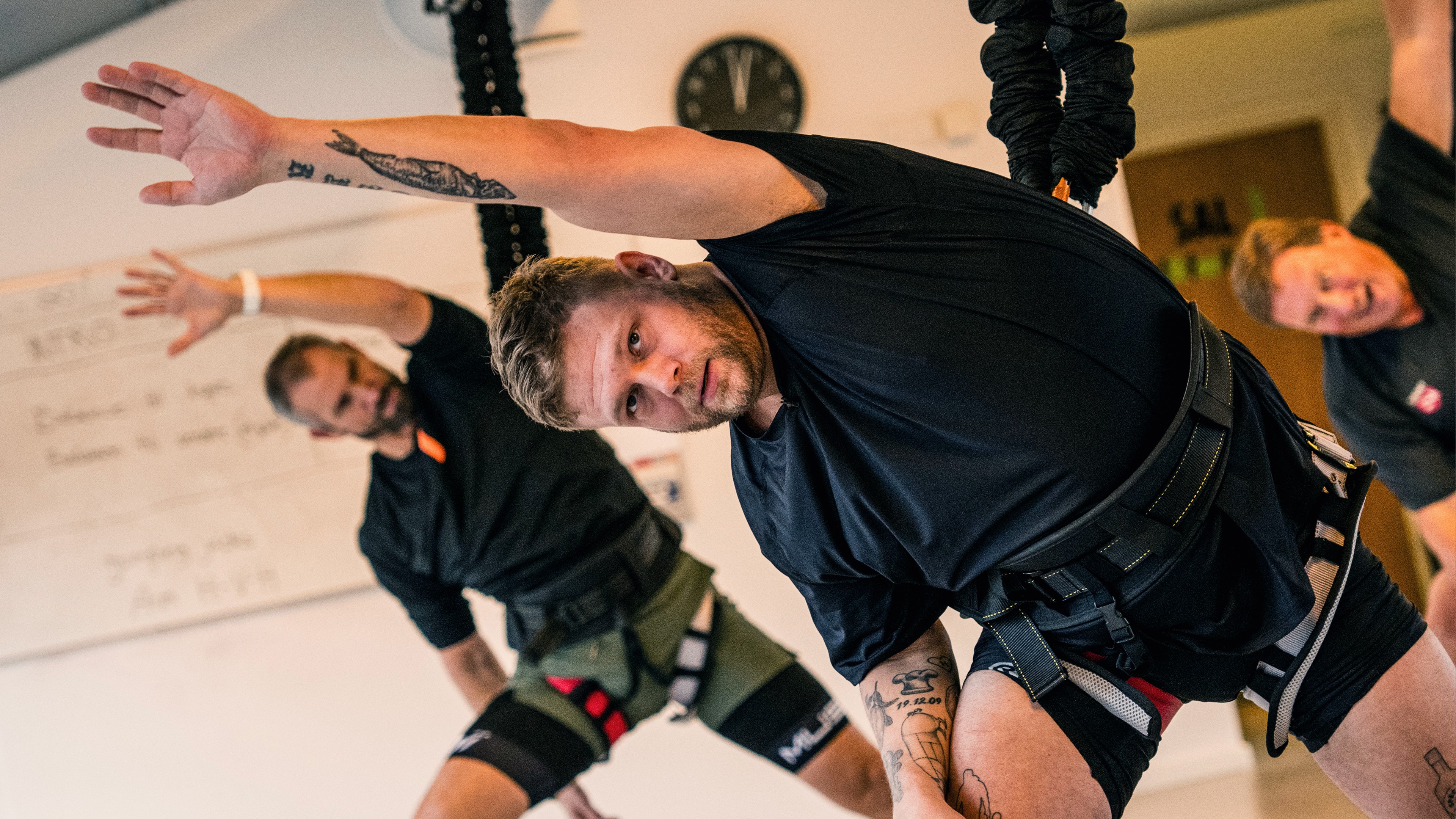 Kokkene bliver monteret i en sele i loftet, når de skal prøve kræfter med Bungee Fitness. Det viser sig at være hårdere end ventet. Menuen er vegansk mad. .