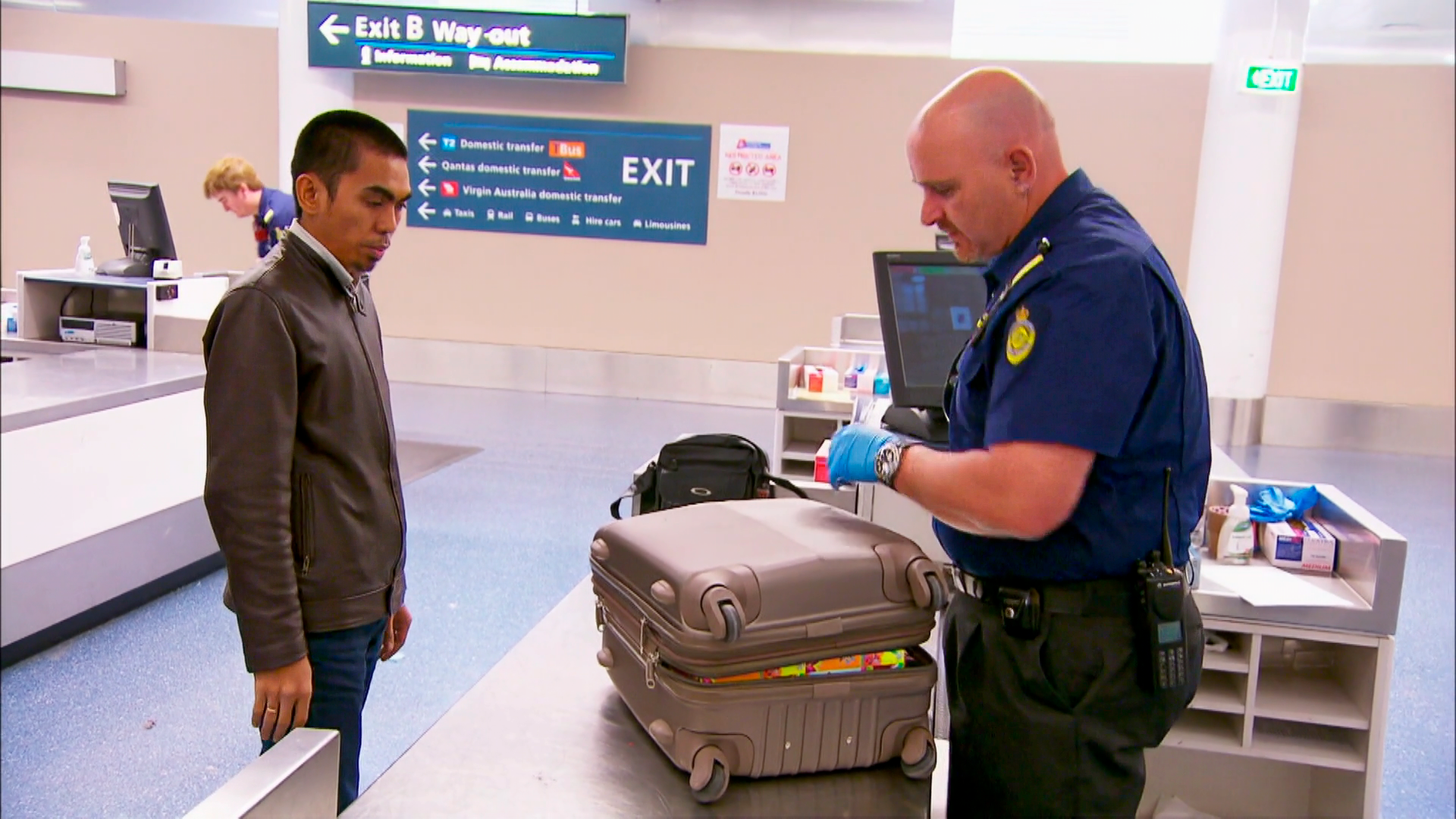 En kvinde holder op med at grine, da der bliver fundet forbudte stoffer i hendes taske, og tolderne må kigge en ekstra gang, da de åbner en pakke.