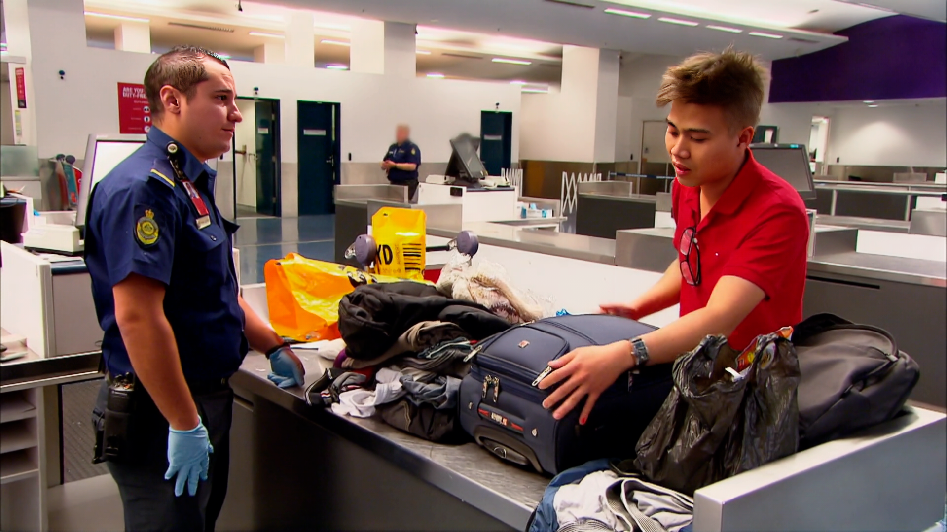 En kvinde holder op med at grine, da der bliver fundet forbudte stoffer i hendes taske, og tolderne må kigge en ekstra gang, da de åbner en pakke.