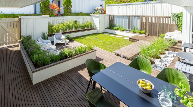 En gammel have skal laves om, så den passer til den moderniserede hus. Så nu anlægges træterrasser, og det hele krones af en krukkehave og klatrevækster.