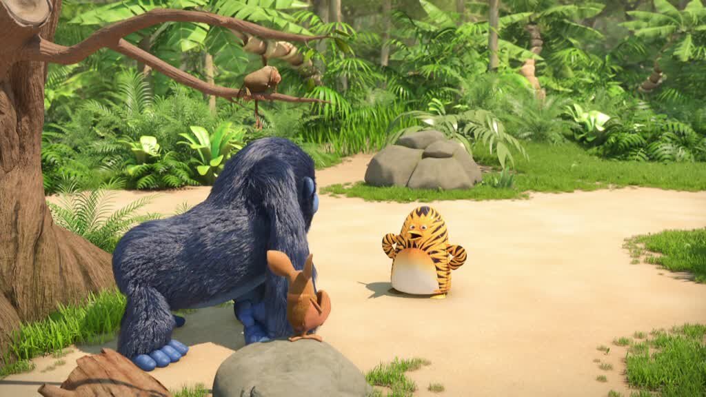 Her kommer junglebanden. Er du i problemer, må du trække i snoren, og så kommer de! Pingvinen Maurits tror, han er en tiger, der lever i junglen.