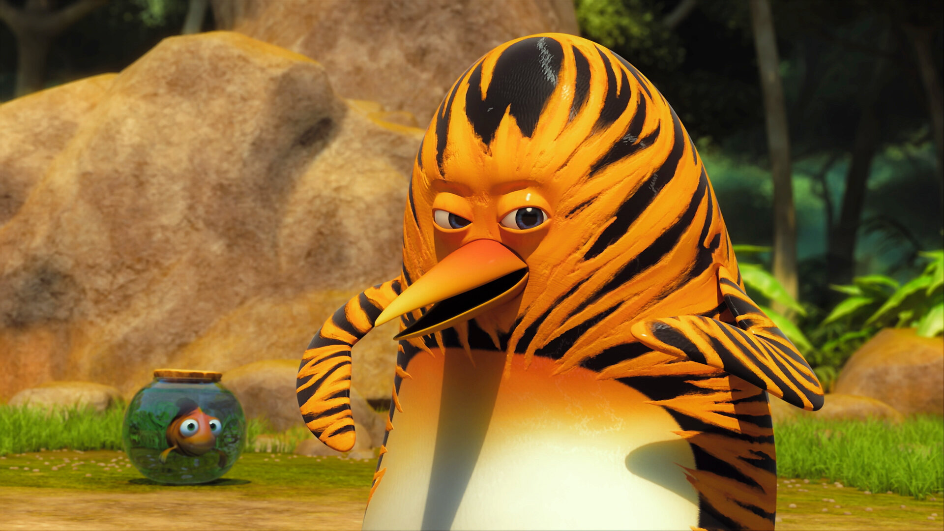 Her kommer junglebanden. Er du i problemer, må du trække i snoren, og så kommer de! Pingvinen Maurits tror, han er en tiger, der lever i junglen.