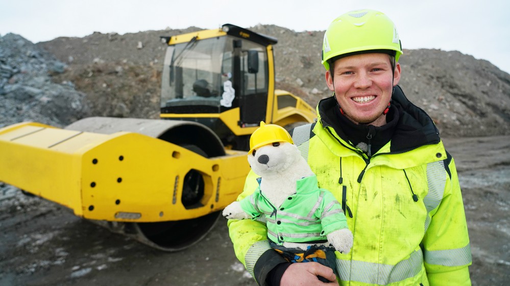 Den kæmpestore gravemaskine kan flytte kæmpestore bunker af grus eller sand med et snuptag. Og Bamse Broom får lov til at køre med.