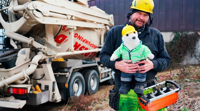 Den store betonblander har en tromle fyldt med beton og en lang slange, der kan pumpe betonen ud. I dag er det Bamse Broom, der styrer pumpen.