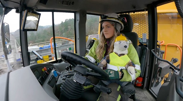 Den kæmpestore gravemaskine kan flytte kæmpestore bunker af grus eller sand med et snuptag. Og Bamse Broom får lov til at køre med.