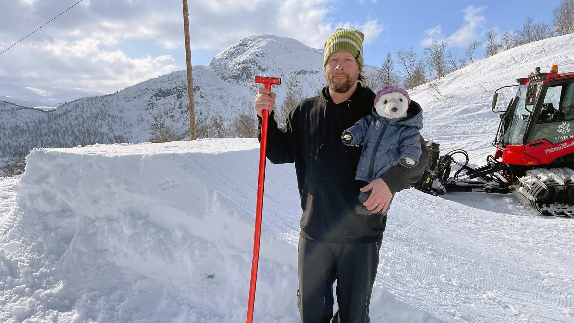 Den store pistemaskine ordner skiløjperne hver morgen. Den kører på de allerstejleste bakker ved hjælp af et trækspil, og Bamse Broom skal med på tur.