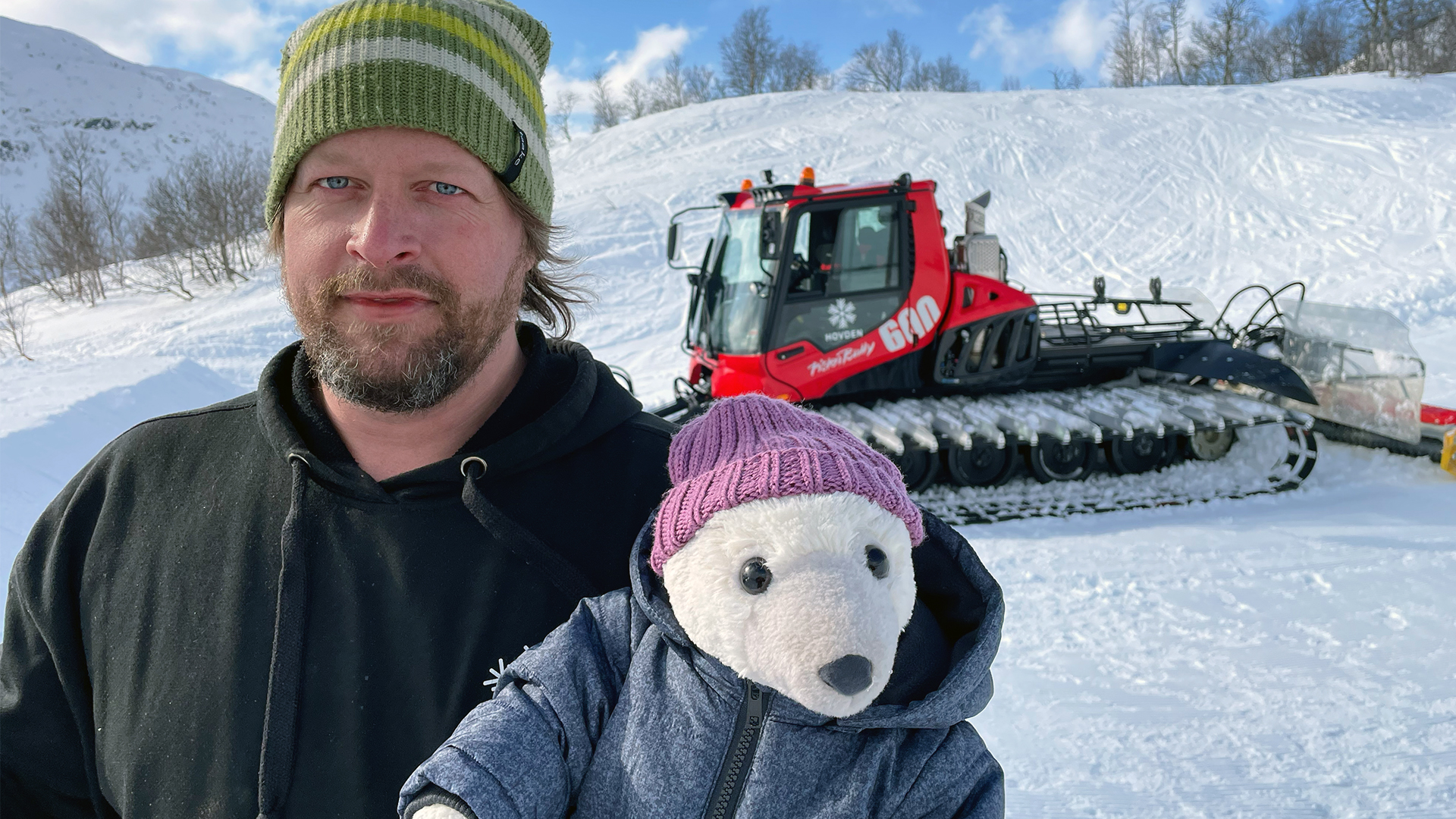 Den store pistemaskine ordner skiløjperne hver morgen. Den kører på de allerstejleste bakker ved hjælp af et trækspil, og Bamse Broom skal med på tur.