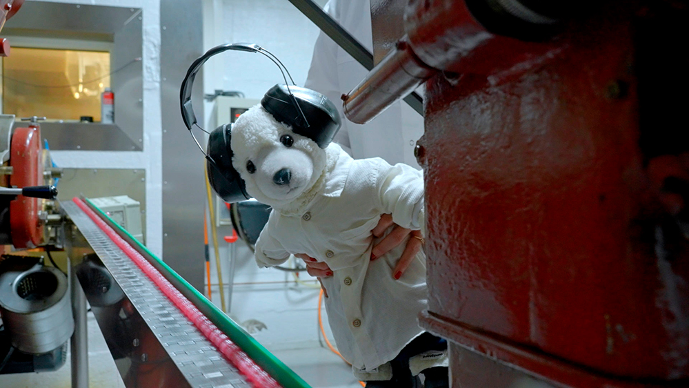 På den lille bolsjefabrik, som Bamse Broom besøger i dag, bruger de maskiner, der er fra forrige århundrede! Men de laver stadig flotte bolsjer