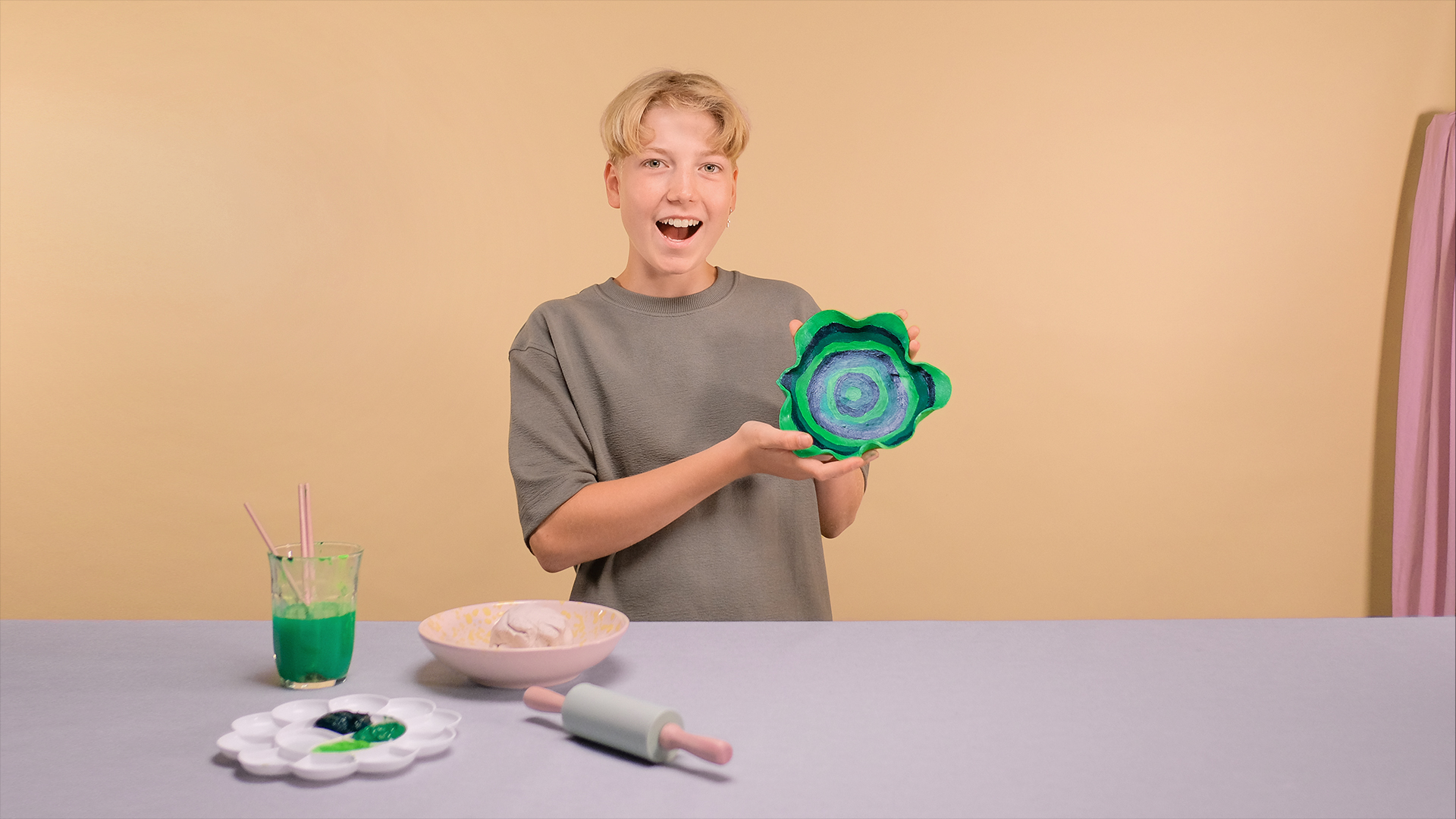 En superflot skål af selvhærdende ler! Den er nem at lave - find blot bagepapir, maling og pensler frem!