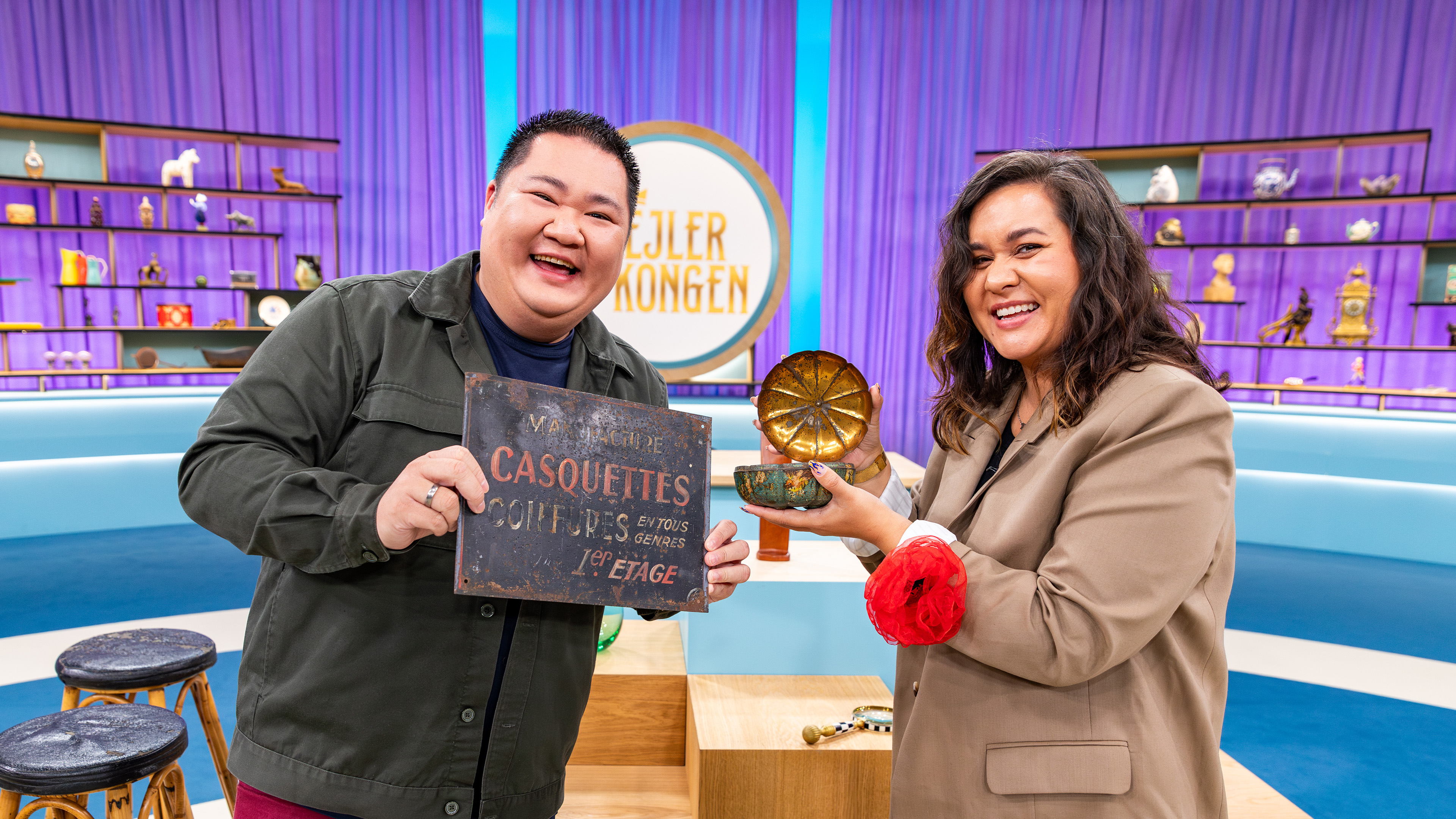Sanger Anders Blichfeldt og skuespiller Lue Støvelbæk skal gætte priser på mange ting - blandt andet en af Lasse Rimmers private.