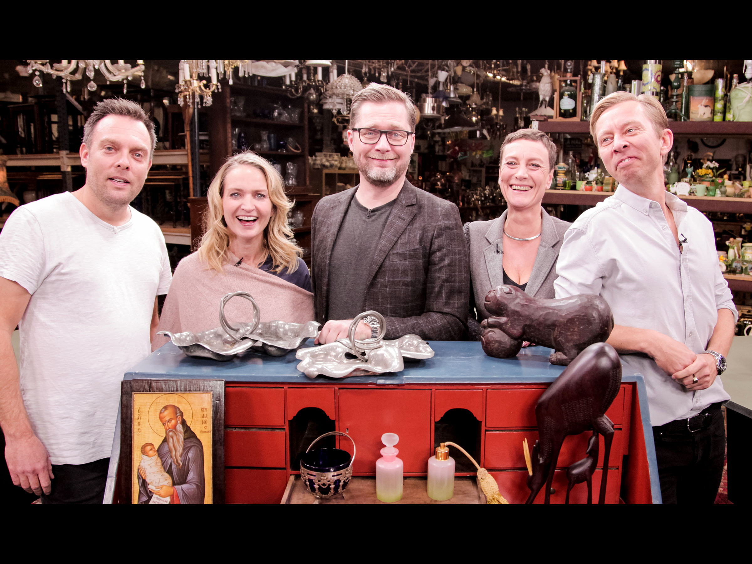 I 'Krejlerkongen' kan man købe det hele - også en ged. Den er dog af porcelæn, men hvad skal den koste? Det og meget andet er op til skuespiller Mikkel Schrøder og nyhedsvært Janni Pedersen at finde ud af sammen med holdkaptajnerne Annette Heick og Brian Mørk