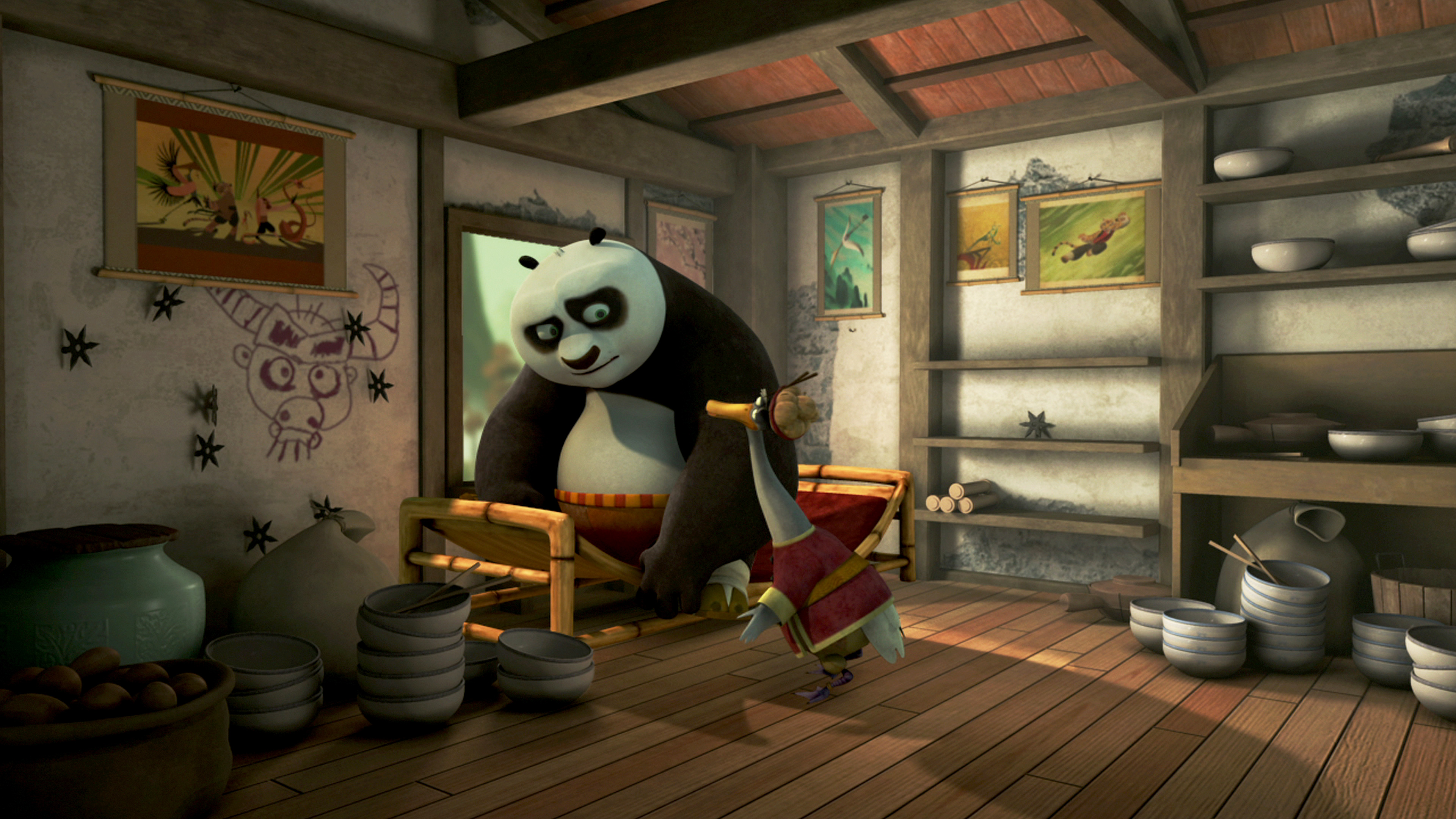 Mester Shifu siger, at den, der kan besejre Po før solnedgang, bliver den nye Dragekriger