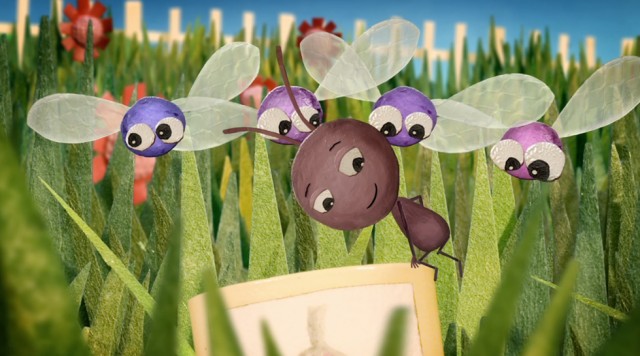 To flueunger er kommet op at skændes om et hindbær. Lillefinger og Myren forsøger at få dem til at enes.