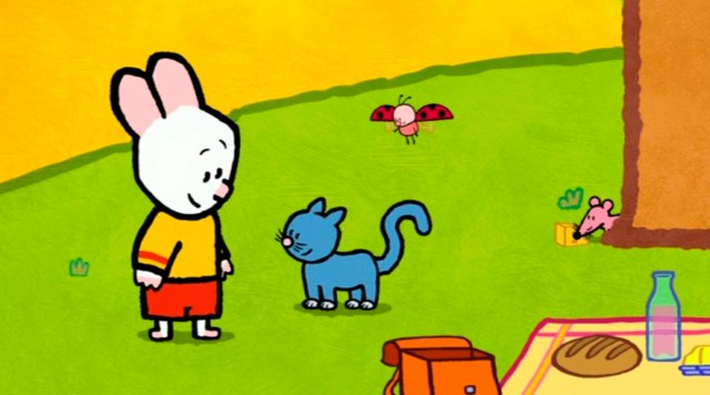Louie og Yoko holder picnic. En mus stjæler et stykke ost fra dem. Louie tegner en kat, som skal fange musen og få osten tilbage. Men katten er doven!