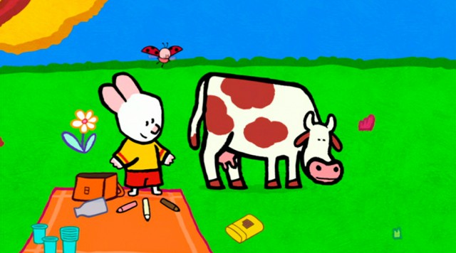 Louie og Yoko har væltet flasken med mælk. Hvordan skal de nu lave deres varme kakao? Louie tegner en meget rar ko, som lader dem malke den.