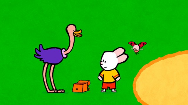 Yoko har mistet sine marmorkugler i sandet, og de er svære at finde! Louie tegner en struds, der kan stikke hovedet i sandet. Den kan nemt finde marmorkuglerne.