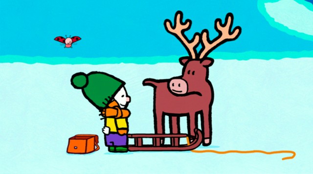 Louie og Yoko vil gerne kælke. Louie tegner et rensdyr. Rensdyret kan trække kælken og tage de to venner med på en dejlig køretur i sneen.