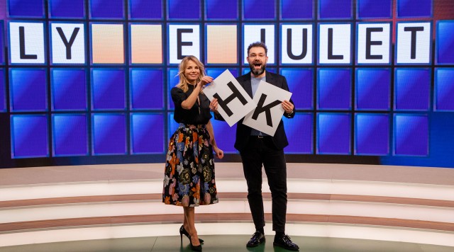 Mikkel Kryger og Kanya Natasja Rørbech er klar med en ny omgang hjernegymnastik, når de drejer 'Lykkehjulet' og udfordrer tre nye deltagere i ordgåder. .