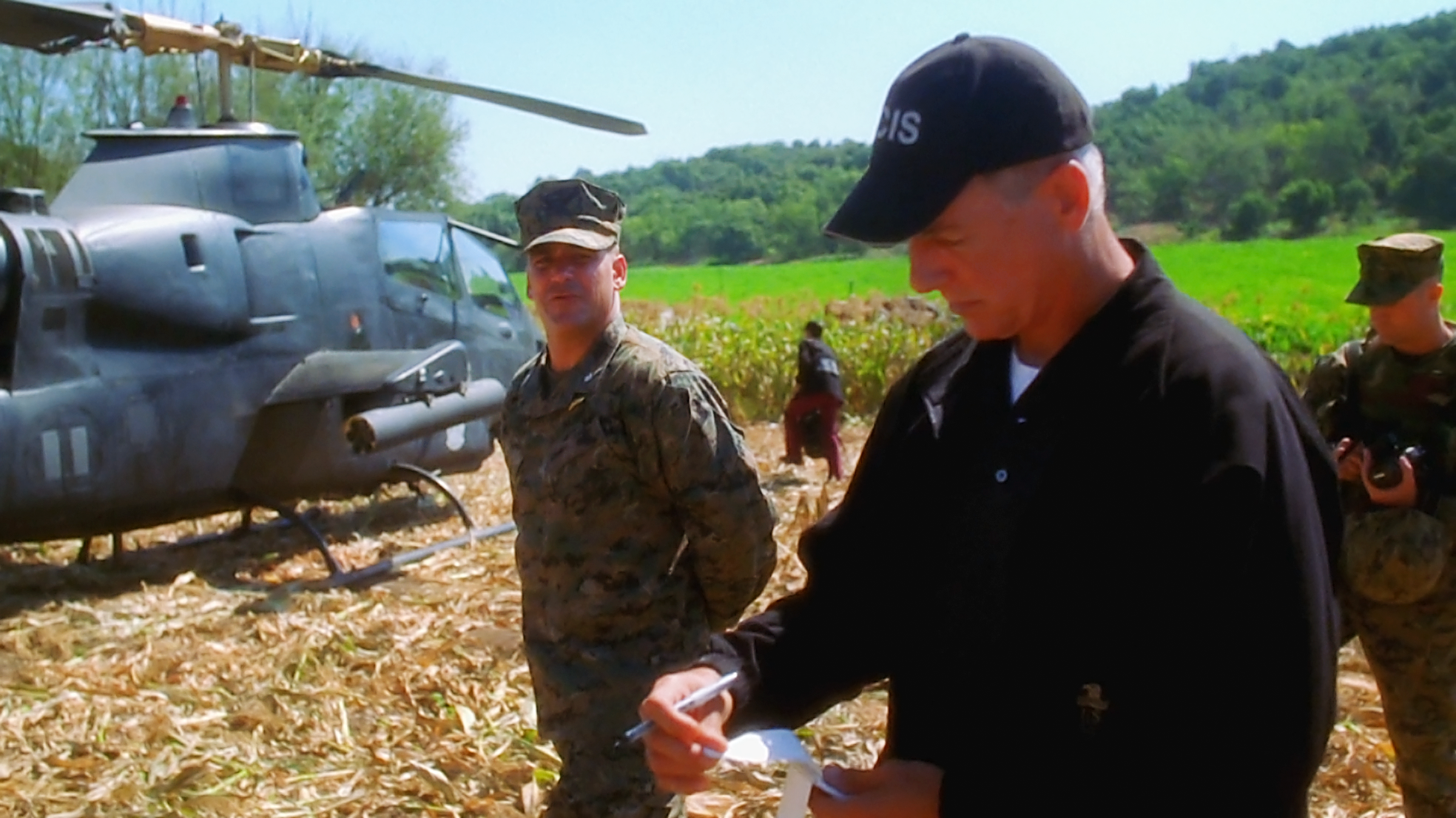 Holdet undersøger en marinehelikopter, der dukker op midt i en korncirkel.