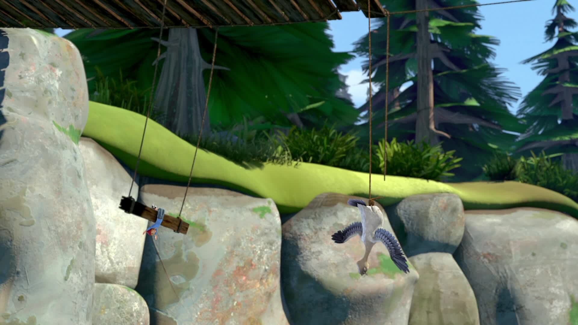 Nils formår at flyve bag et vandfald på Gorgos ryg. Begejstrede over bedriften flyver de videre og ser en gruppe migrerende storke i det fjerne.