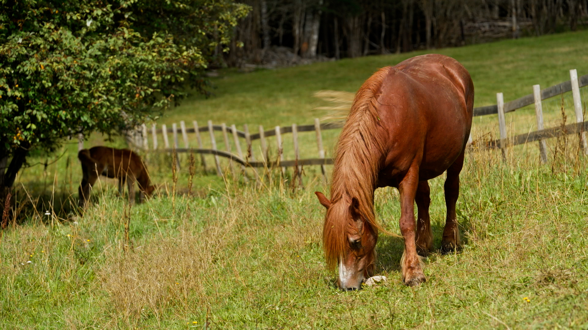 Se, når hesten har sit føl med på græs. Føllet leger og dier fra sin mor.