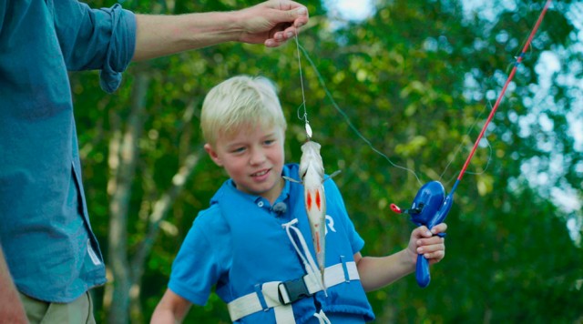 Thorvald og Einar Georg vil gerne på fisketur i dag. Så de pakker alt deres fiskegrej og går ned til elven for at fiske. Thorvald er så heldig at han får bid!