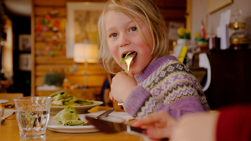 Thorvald og familien skal lave pandekager, men ikke helt almindelige pandekager. De vil nemlig lave grønne pandekager, som de farver med brændenælder.