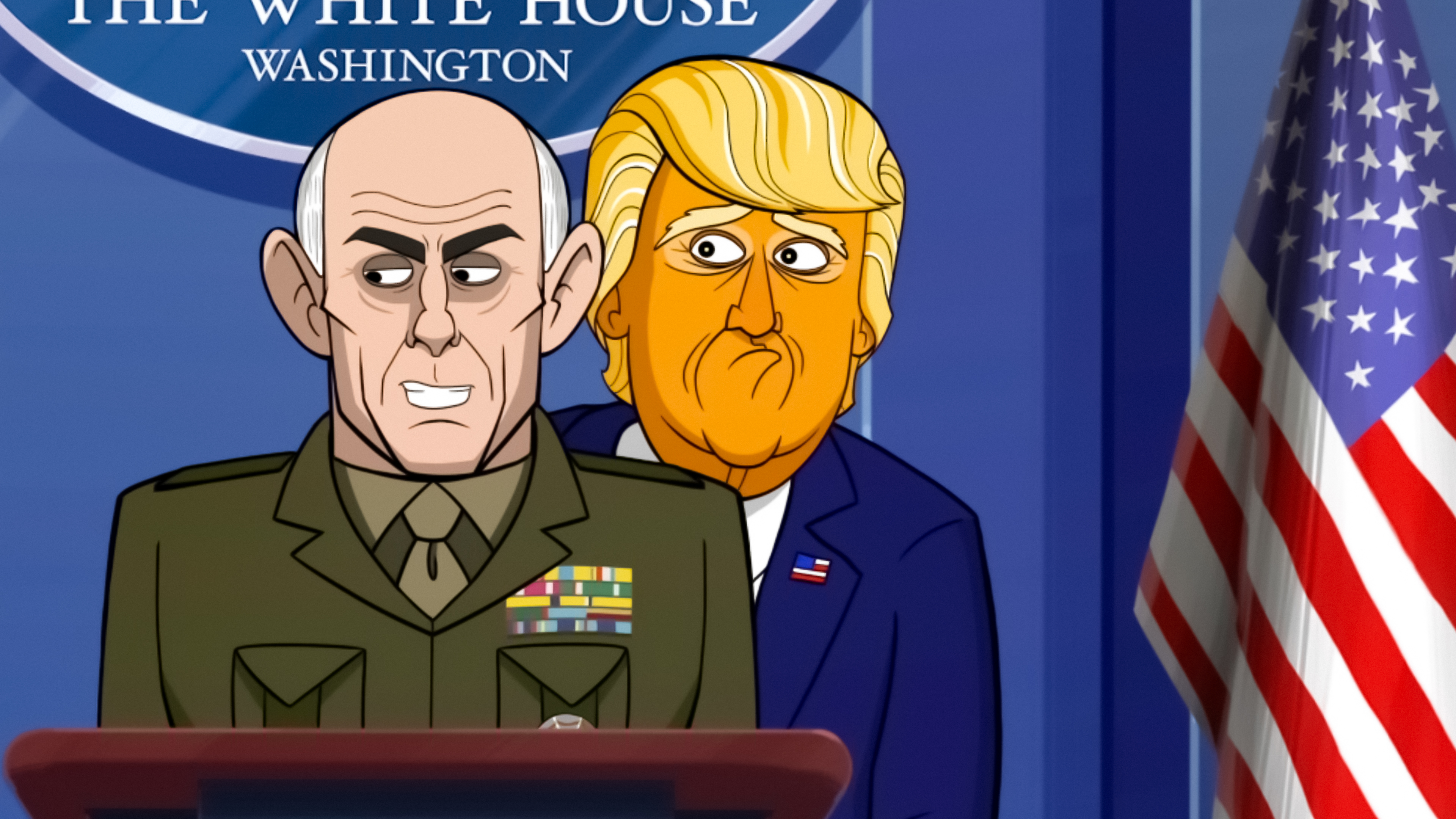 Vores tegneseriepræsident militariserer regeringen og afholder en militærparade med hjælp fra sikkerhedsrådgiveren John Bolton.