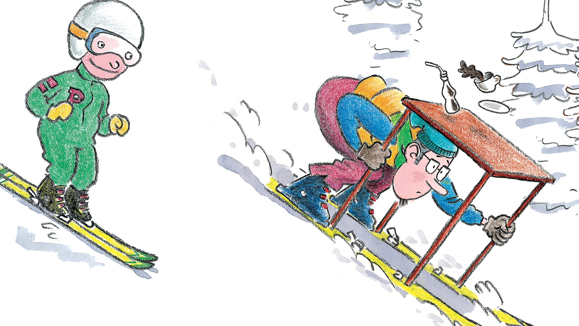 Palles fars ene ski smutter fra ham. Han forsøger at fange den. Han suser afsted på kun én ski. Hu, hej, hvor det går ned ad bakke og lige ind på hotellet.