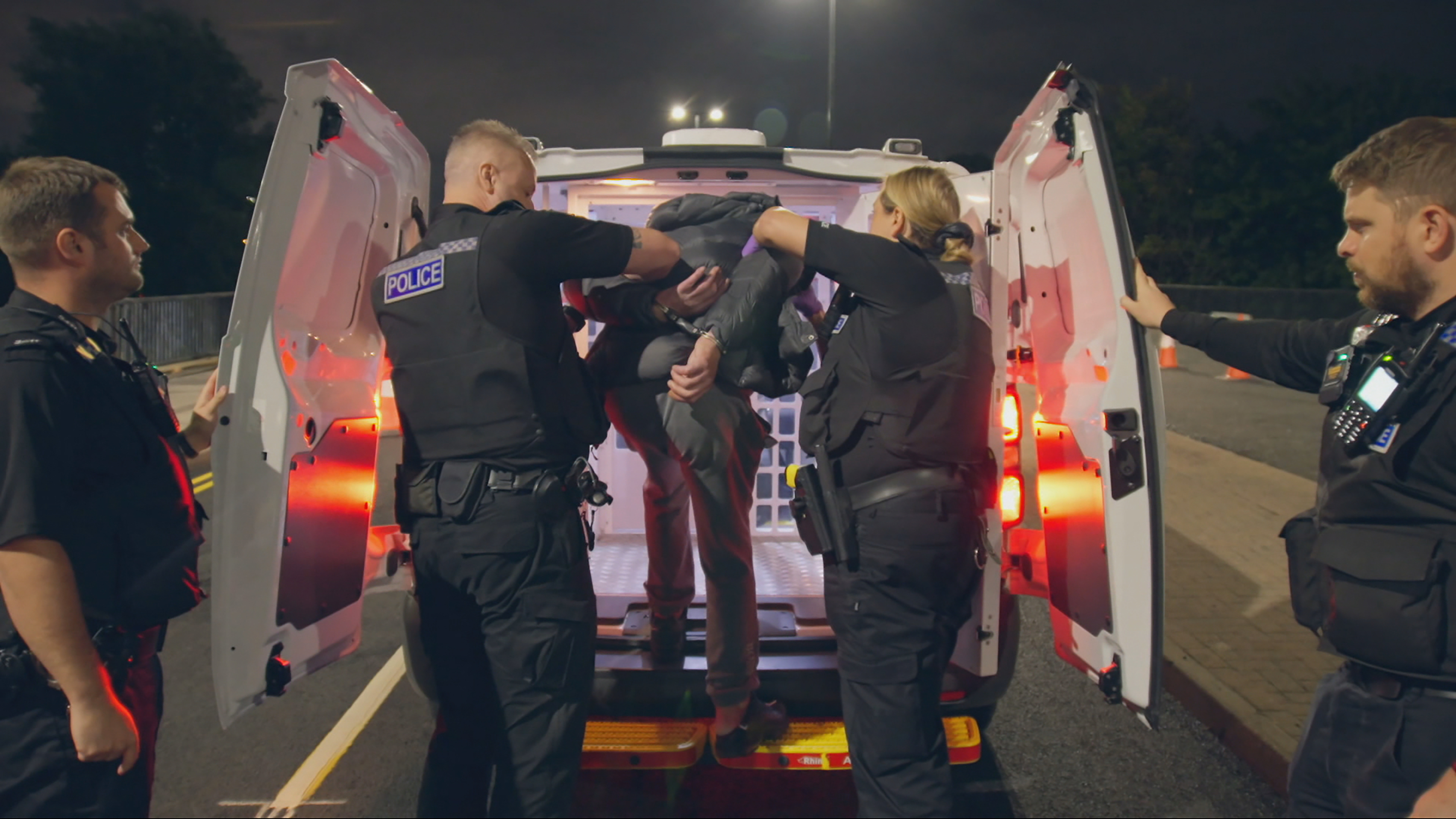 Betjentene patruljerer i bymidten og håndterer vold og uro blandt festglade borgere i nattelivet.