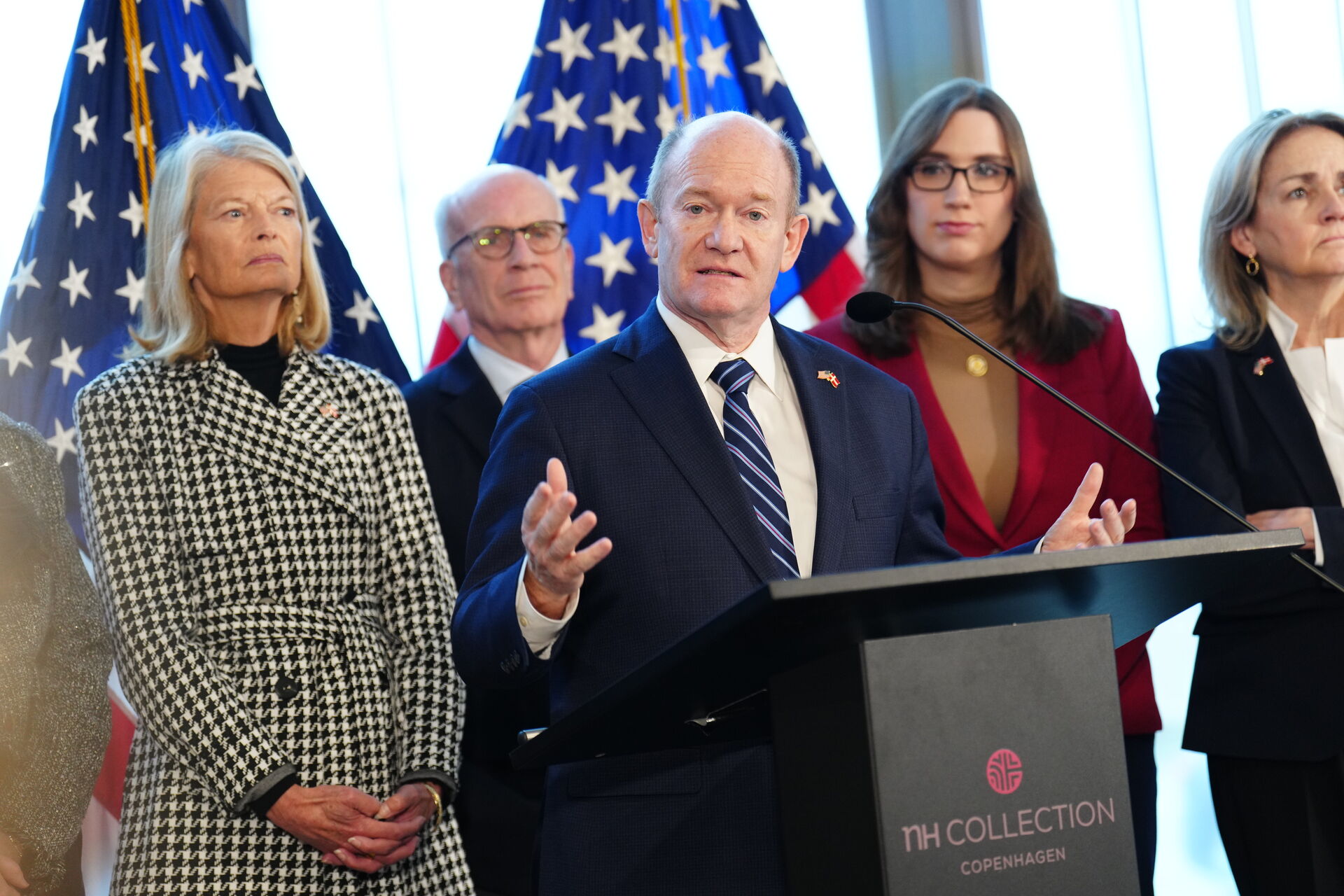 Senatorerne Chris Coons (D) og Lisa Murkowski (R) samt Christian Friis Bach, Pipaluk Lynge og Aaja Chemnitz holder pressemøde.