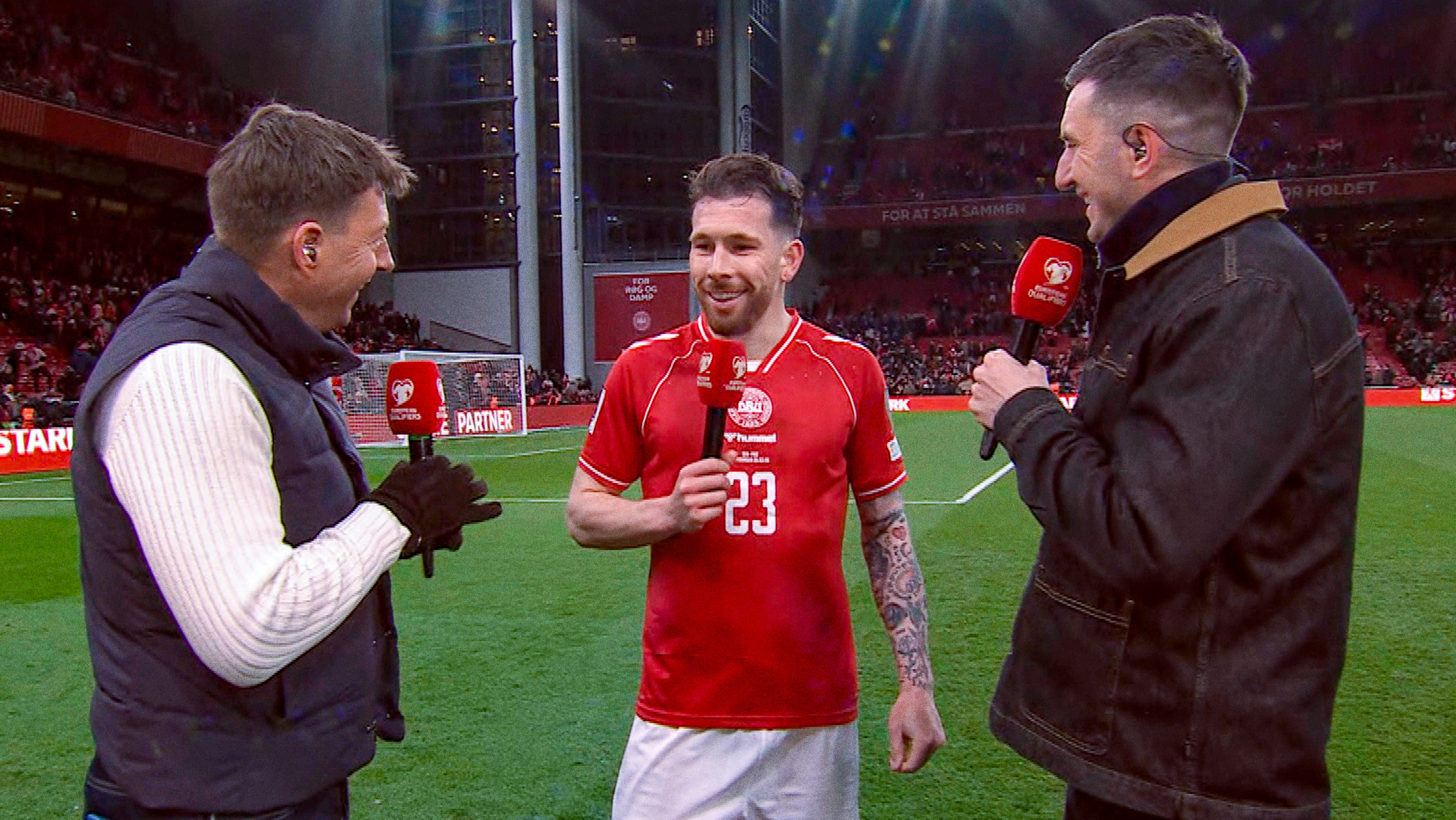 Hør fra Gustav Isaksen, Pierre Emile Højbjerg, Christian Nørgaard, Brian Riemer og landsholdsdebutant Kasper Høegh efter den vigtige kamp mod Nordmakedonien.