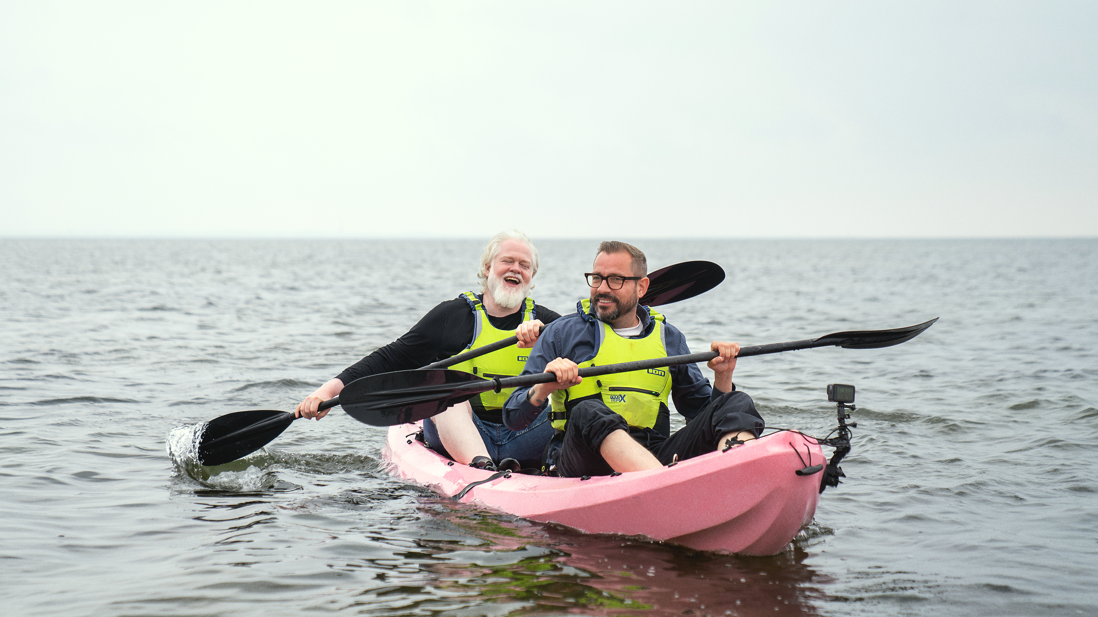 Vennerne Esben Dalgaard og Adam Duvå Hall tager med Hans Pilgaard til Halsnæs, men kan venskabet holde til en tur i dobbeltkajak?