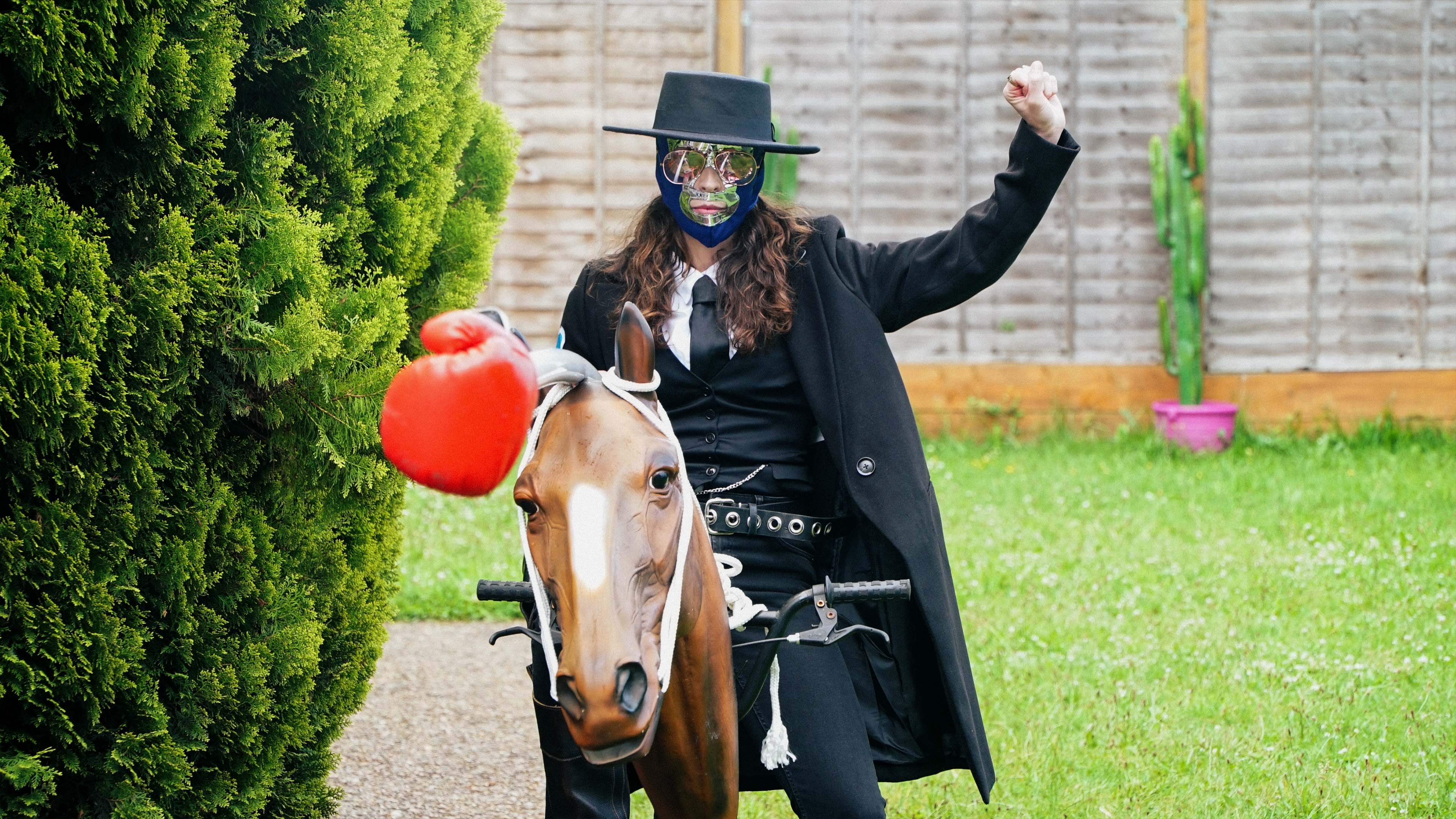 Bridget Christie putter legetøj ind i en trafikkegle for at skabe en scene, der næsten rører Alex Horne til tårer. Imens imiterer Sophie Duker en dinosaur.