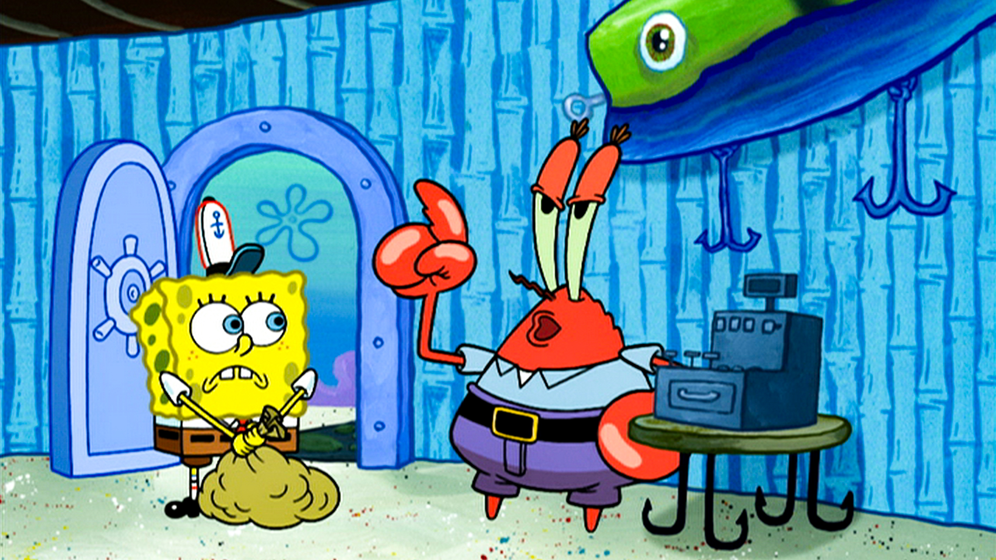 Det er fotodag til sejlsportskolens årlige album. Da Patrick æder sin egen vægt i krabbeburgere uden at betale, sætter hr. Krabbe ham til at arbejde.