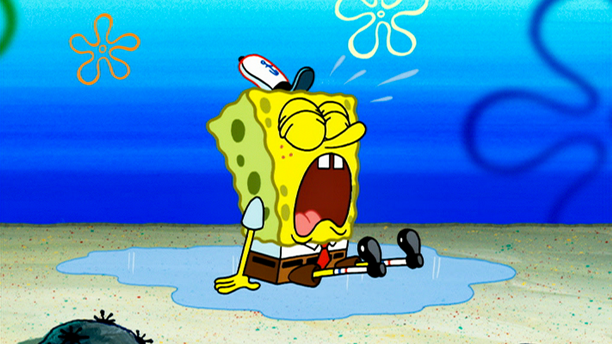 Ved et uheld under arbejdet på Den Knasende Krabbe får Svampebob en splint. .