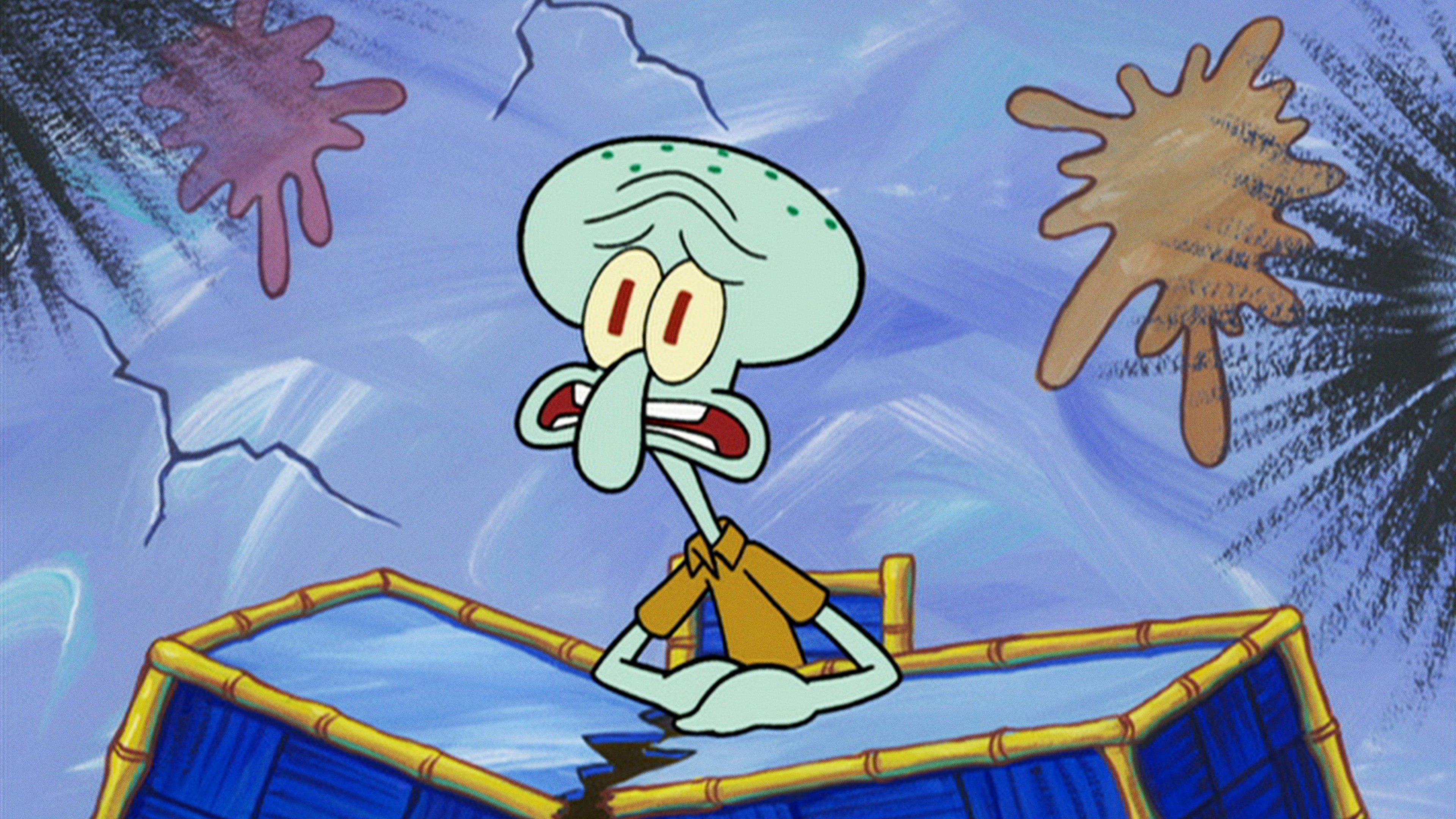 Blækward må blive indendørs sammen med Svampebob og Patrick under en storm. .