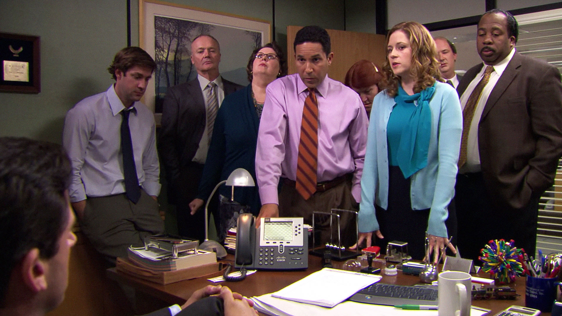 Michael lader kontoret gøre grin med sig. Jim har en dybfølt samtale med Pams far