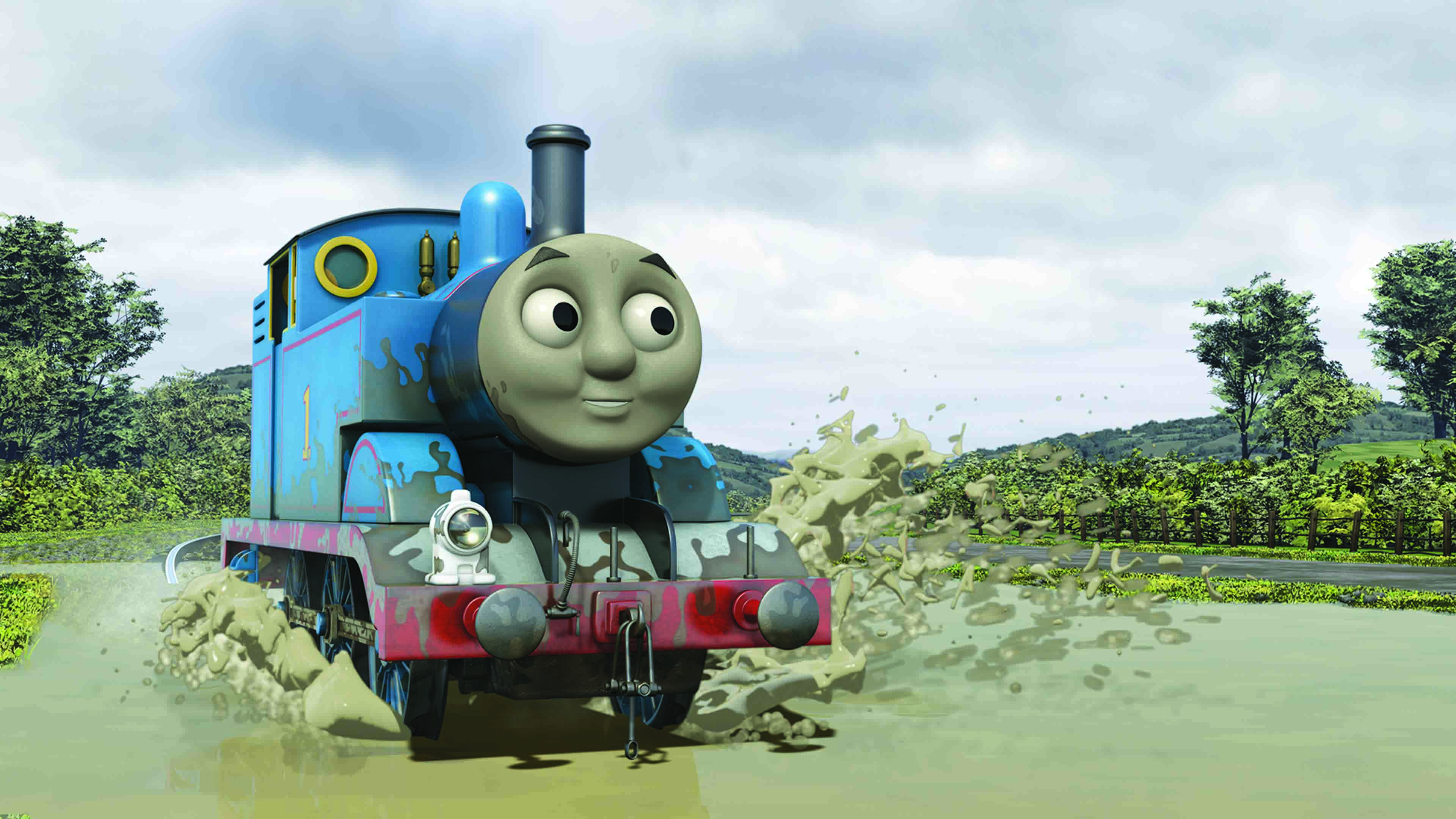 Thomas har fundet på en ny leg, der går ud på at køre stærkt igennem en vandpyt, så han sprøjter på de andre lokomotiver